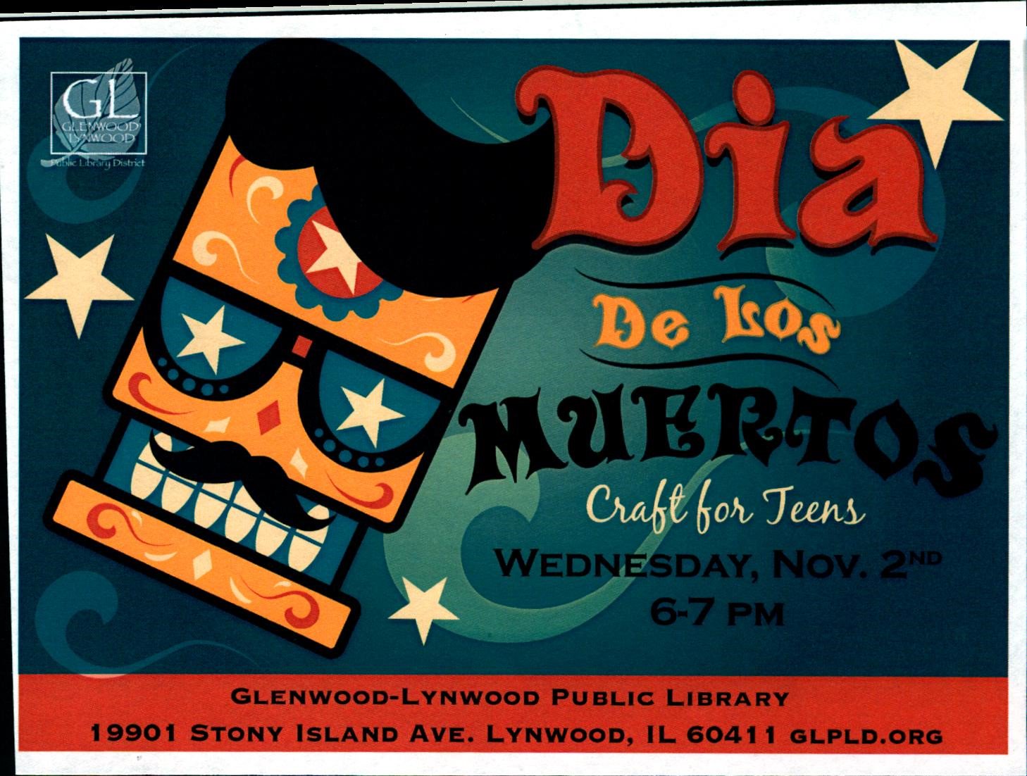 Dia De Los Muertos (Craft for Teens) When: Wednesday, November 2, 2016 at 6:00 PM to Wednesday, November 2, 2016 at 7:00 PM Contact: Phone: 708-758-0090