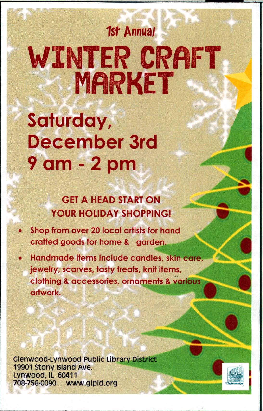 Winter Craft Market When: Saturday, December 3, 2016 at 9:00 AM to Saturday, December 3, 2016 at 2:00 PM Contact: Phone: 708-758-0090